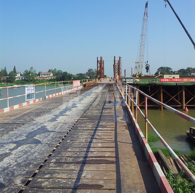 橋麵采用裝配式鋼橋定型橋麵板,製作好的橋麵板安放在貝雷片縱梁上並用螺栓連接,為安裝橋麵欄杆需要每隔一片麵板間安裝一根十二厘米槽鋼。